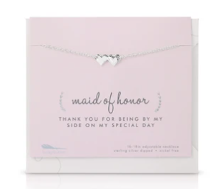 The Best Day Ever Bridal collection features nickel-free and sterling silver dipped charm necklaces with adjustable 16-18" chains. Pendant charms are about 1/2 in and fixed on the chain. Necklace comes packaged on giftable and sentimental card with miniature envelope.