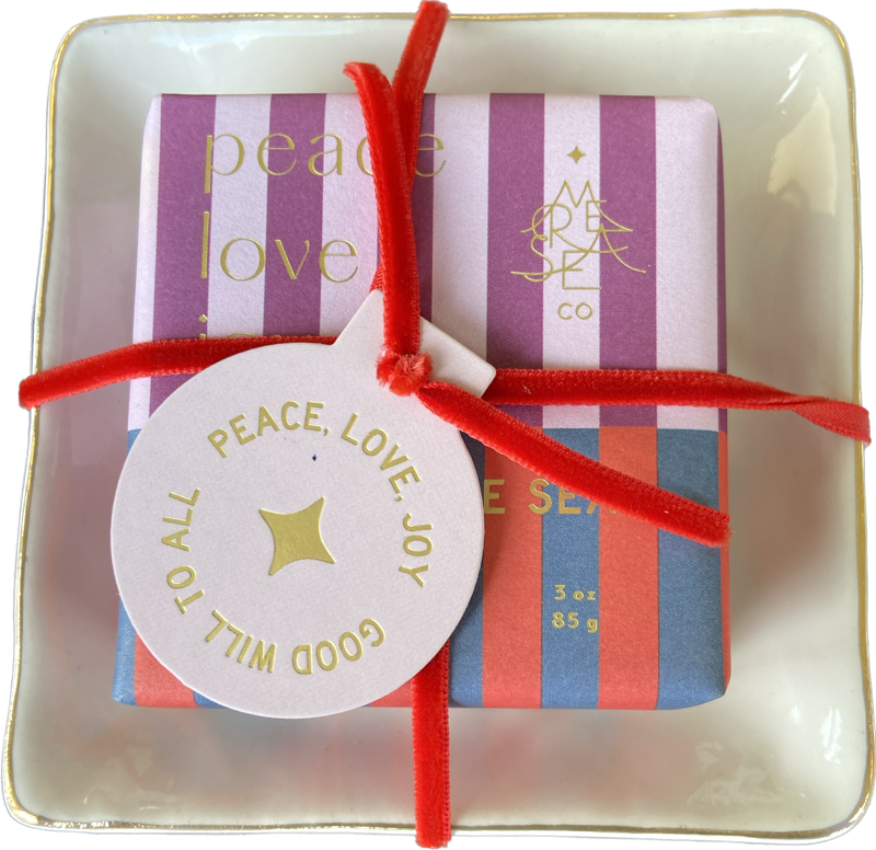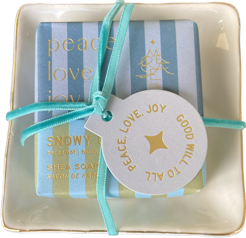 3oz. square wrapped shea soap, comes with a ceramic soap dish that says 'Peace, Love, Joy'