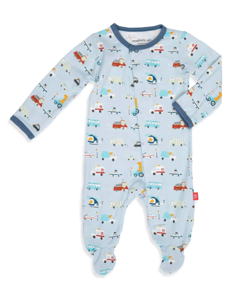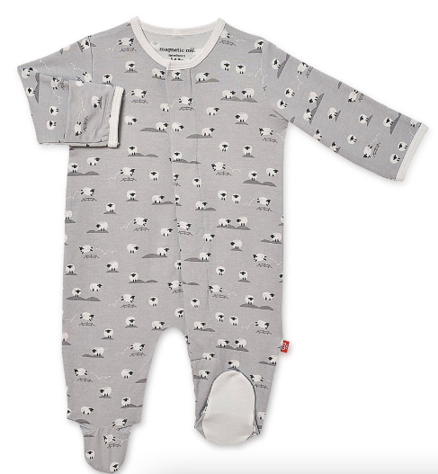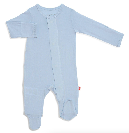 A soft, stylish all-day and all-night wardrobe staple with smart magnetic fasteners that makes changing time painless. With our no over-the-head design, simply open the outfit, insert baby, and BOOM, DONE! - the footie practically closes itself. Machine wash as directed.